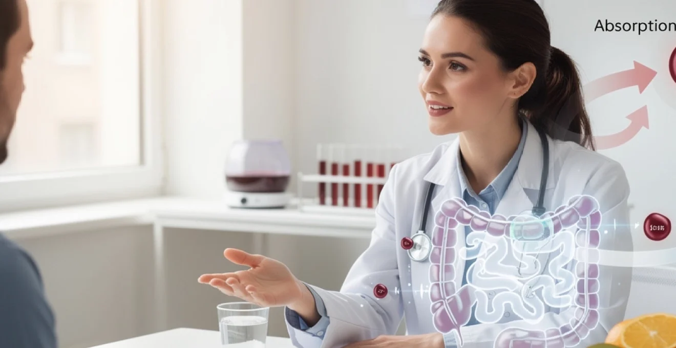 À l’inverse, certains médicaments diminuent l’absorption du fer en modifiant le pH gastrique ou la motricité intestinale : inhibiteurs de la pompe à protons (oméprazole, esoméprazole…), antiacides contenant du calcium ou de l’aluminium, certains pansements gastriques. Chez les patients sous traitement prolongé par IPP, la correction d’une carence martiale peut être plus lente, nécessitant parfois une adaptation des doses ou le recours à des formes plus biodisponibles comme le bisglycinate ou le fer liposomal.